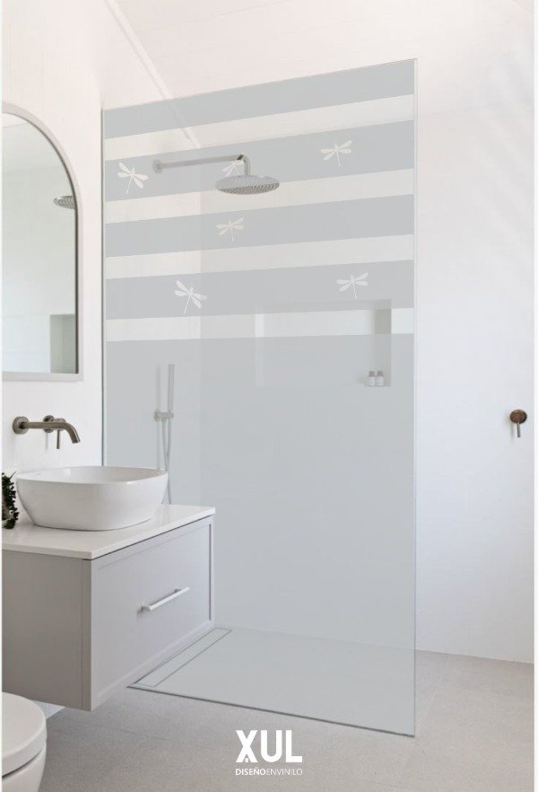 Podes elegir diseños calados, es decir que se vea el vidrio y te permita el ingreso de luz directa o podes elegir diseños montados, es decir, el dibujo que elijas se hace en el color que desees y luego se pega directamente sobre la base de vinilo esmerilado pleno.