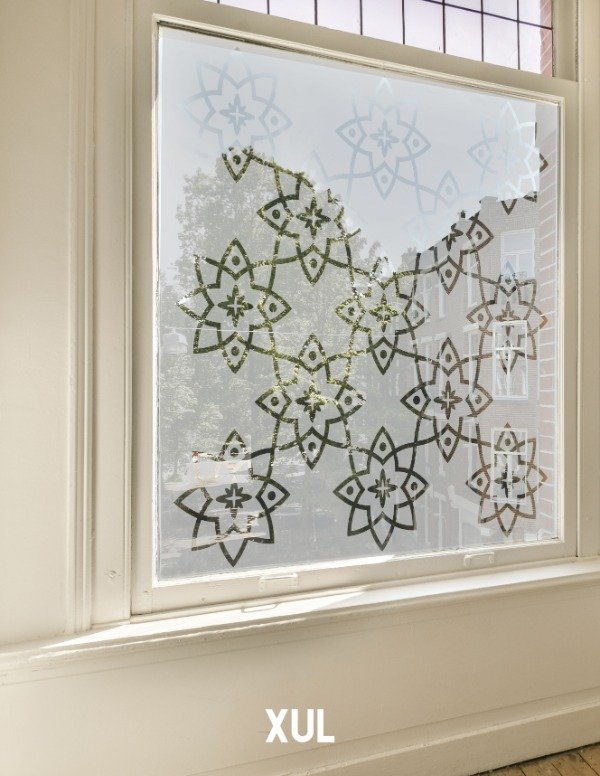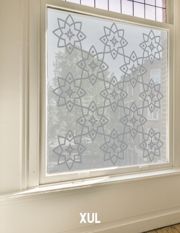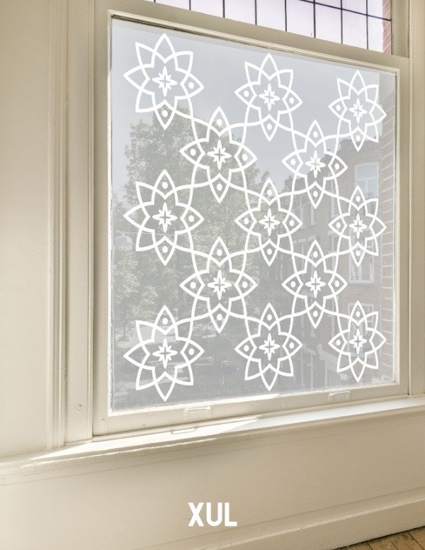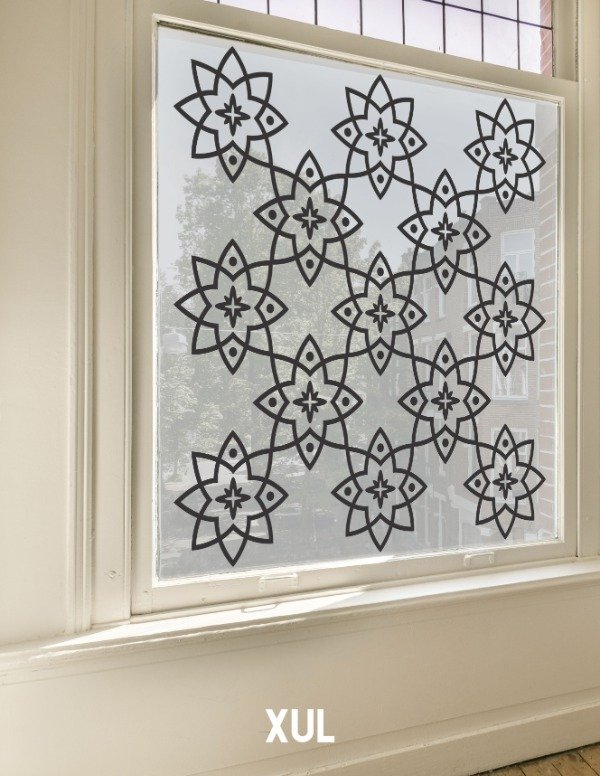 Podes elegir diseños calados, es decir que se vea el vidrio y te permita el ingreso de luz directa o podes elegir diseños montados, es decir, el dibujo que elijas se hace en el color que desees y luego se pega directamente sobre la base de vinilo esmerilado pleno.